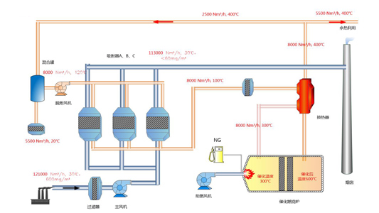 大風(fēng)量、低濃度有機(jī)廢氣通入活性炭吸附床,與蜂窩狀活性炭充分接觸,凈化,并脫附再生后轉(zhuǎn)換成小風(fēng)量、高濃度的有機(jī)廢氣被送往催化燃燒床進(jìn)行氧化,在280℃以上時(shí)有機(jī)物被氧化分解成二氧化碳、水等無(wú)害氣體。燃燒后的熱廢氣通過(guò)熱交換器加熱冷空氣,熱交換后降溫的氣體部分排放,部分用于蜂窩狀活性炭的脫附再生,達(dá)到廢熱利用和節(jié)能的目的。